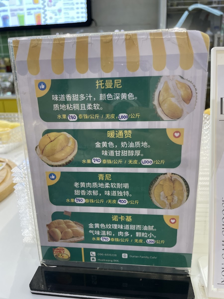 Welcome to DurianFamily Cafe' - 榴莲家族, a haven for durian enthusiasts located in the heart of Bangkok. This charming cafe specializes in an array of unique durian-based dishes that celebrate the king of fruits. The menu showcases many exciting options, each highlighting the rich, bold flavor of durian.